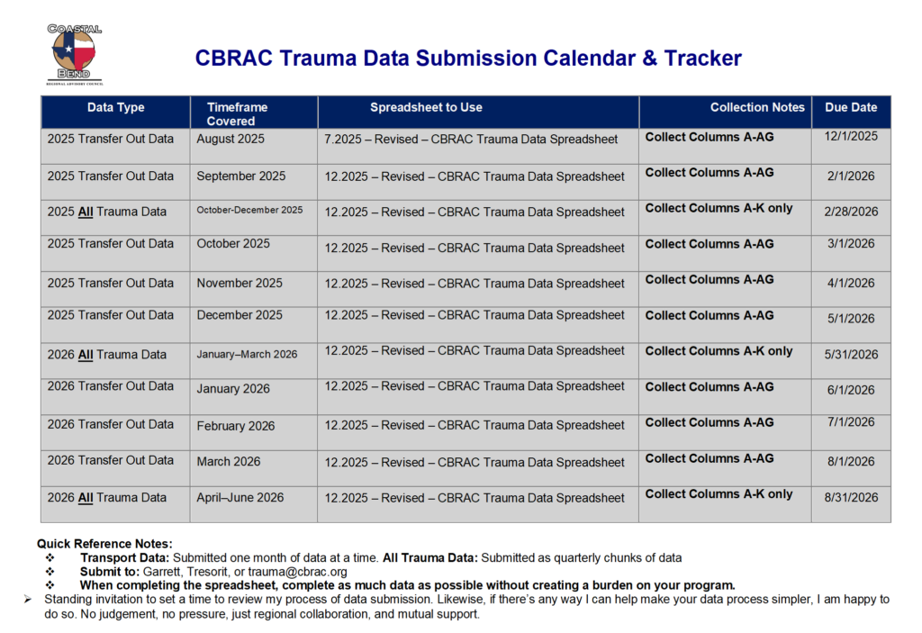 The Coastal Bend Regional Advisory Council TSA-U promotes the reduction of the incidence, severity and cost of intentional and/or unintentional injuries through the implementation of effective prevention strategies, to include education, improved technology and public policy. In efforts to promote the reduction of the incidence, severity and cost of intentional and/or unintentional injuries, the Coastal Bend Regional Advisory Council TSA-U will utilize the state trauma registry database and other state and national databases to catalog and identify trauma trends in the region in order to implement strategies to reduce these trends.